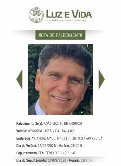 Ele faleceu após complicações decorrentes de uma cirurgia cardíaca realizada em Nova Mutum, onde estava internado na Unidade de Terapia Intensiva (UTI). O velório será realizado nesta terça (17), a partir das 9h, no Memorial Luz e Vida, em Sinop. O sepultamento está previsto para as 16h.
